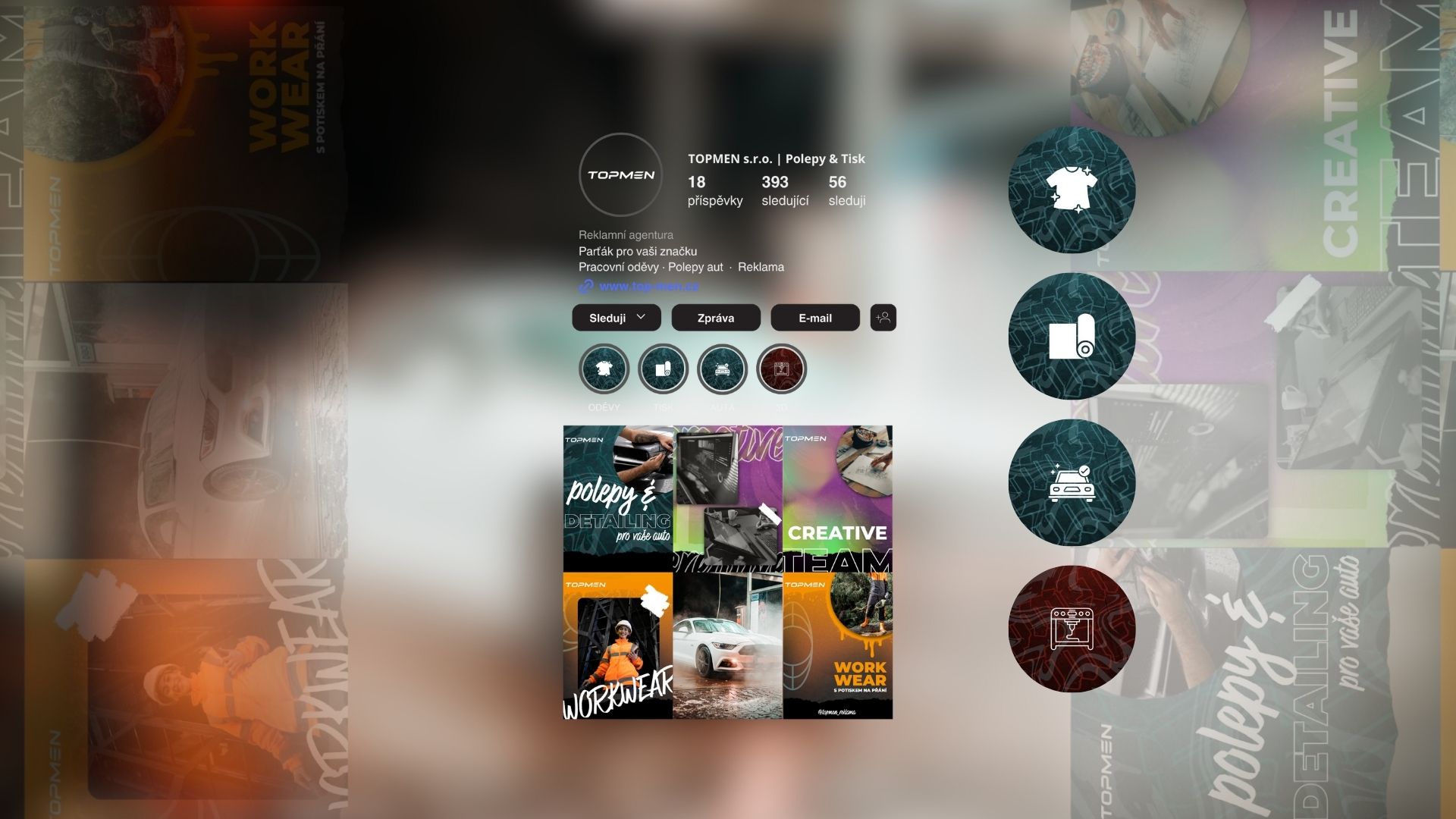 Výsledkem je moderní, výrazný a záměrně „neuklizený“ vizuální styl, který odráží kreativní a akční charakter značky. TOPMEN díky tomu působí svěže, nebojí se barev a jasně komunikuje, že jde o firmu, která stojí mimo klasické korporátní škatulky.